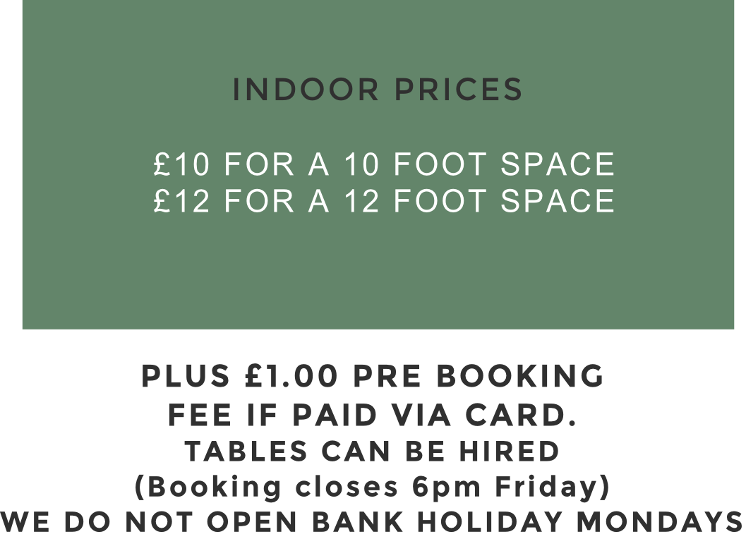 1. We hire out tables but you might like to bring your own clothes rail, ground sheet or boxes to present items in. You can arrange your items on a tablecloth, it always looks more appealing than straight onto a table but it is not necessary.